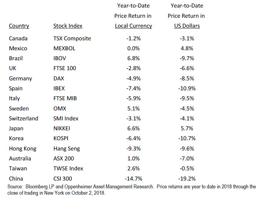 The appreciation of the US dollar since late March has dampened returns for US investors on most foreign stocks. We show below the sharp difference in price returns on foreign stock market indexes priced in those nations’ local currencies versus returns in US dollar terms in the year to date. In many markets, local currency returns exceed those priced in dollars (Mexico and Japan are exceptions).