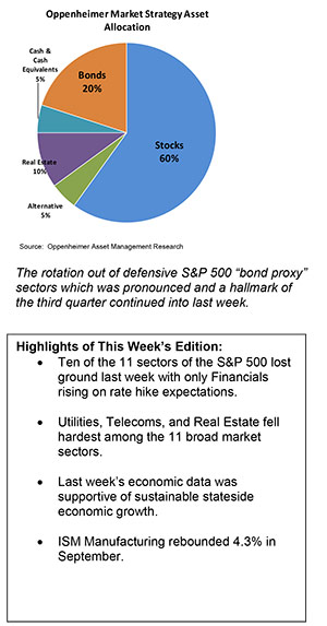 The rotation out of defensive S&P 500 “bond proxy” sectors which was pronounced and a hallmark of the third quarter continued into last week.
