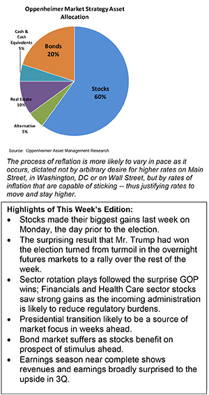 For all the headline attention on how far stocks rallied last week post the election night swoon, we find it curious that the Dow, the S&P 500 and the Nasdaq each posted their best daily gain for the week on the day prior to the election—rising respectively 2.08%, 2.22% and 2.37% on Monday. Talk about the stock market as a discounting mechanism—or was it the news that the FBI wasn’t planning to reopen its investigation that provided markets with such relief the day before the election? Probably the latter but we’ll likely never know for sure.